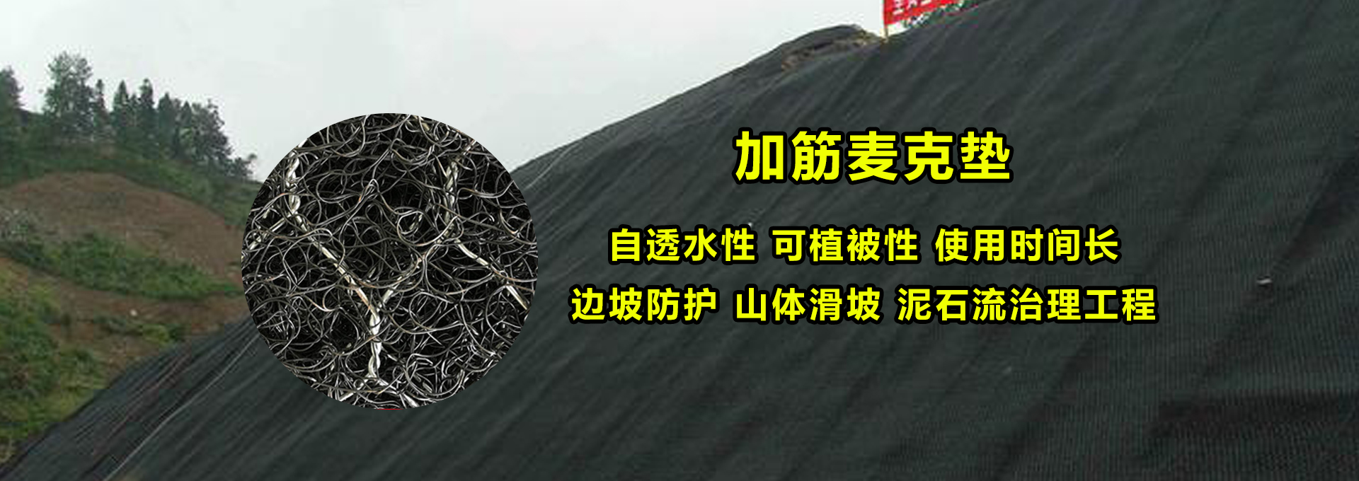 加筋麥克墊由聚丙烯土工墊結合六邊形雙絞合鋼絲(鍍10%鋁鋅合金鋼絲)網構成的土工合成材料。